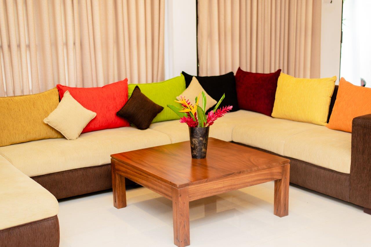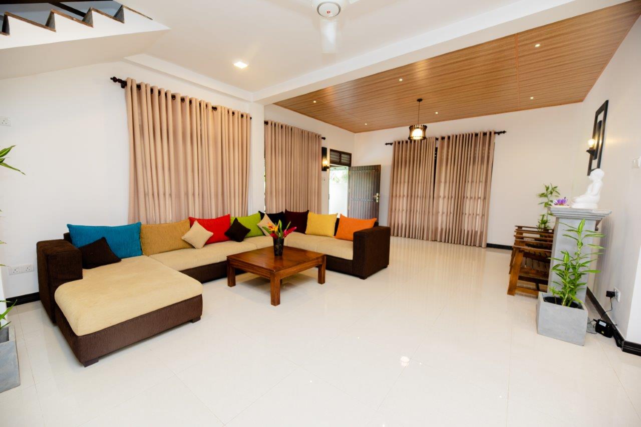 The Ground Floor accommodates 02 Bed rooms , 01 Bathroom . Lounge and a common dining area. Guests can also try some cooking in the adjoining main Kitchen. There is a Laundry machine and a Refrigerator placed in the common space.